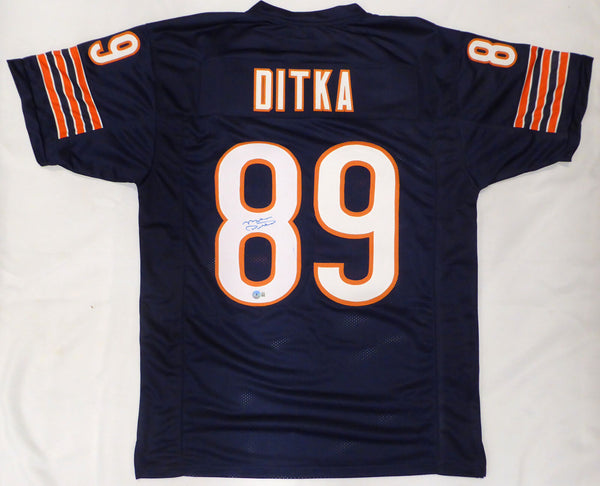 This is a Blue Jersey that has been hand signed by Mike Ditka. This is a custom jersey with no name brand. The approximate size is XL. It has nice sewn in name and numbers. There are marks on the item as shown. This item has been certified authentic by Beckett Authentication (BAS) and comes with their tamper-proof QR Code hologram that can be verified on the Beckett-authentication.com.