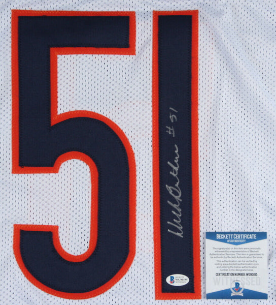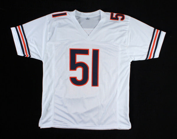 Custom on-field style jersey. Everything is sewn on, size XL. Hand-signed in silver paint pen by Dick Butkus (HOF). The lot / autograph(s) includes an official Beckett Authentication Services serially numbered hologram and matching COA for authenticity purposes.Authentication: Beckett COA
