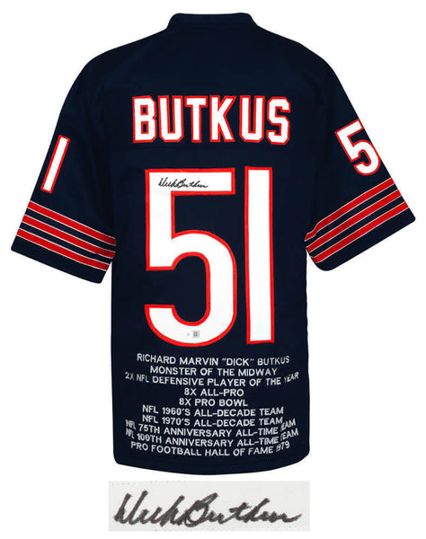 Dick Butkus signed navy embroidered stat custom football jersey. Item comes with a Beckett Authentication tamper evident numbered sticker and matching Certificate of Authenticity which can be verified online. Jersey is size XL.