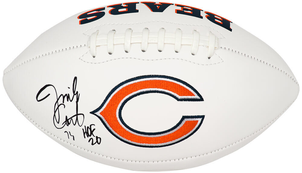 Jim Covert signed Chicago Bears Jarden white panel football with 'HOF 20' inscription. Item comes with a Schwartz Sports Memorabilia tamper-proof numbered hologram and Certificate of Authenticity which can be verified online.