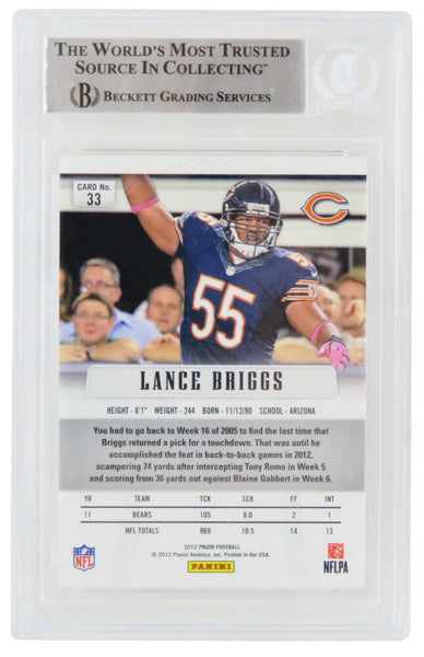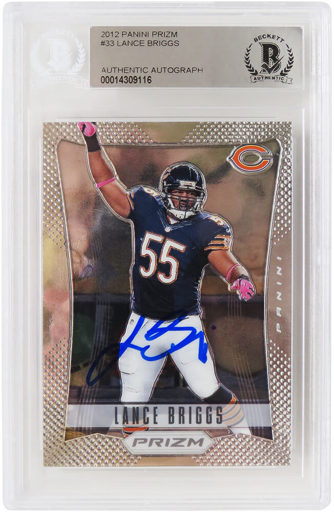 Lance Briggs signed Chicago Bears 2012 Panini Prizm football trading card #33. The card has been authenticated and encapsulated by Beckett Authentic and the authentication number can be verified online. The image of the item is a stock photo, as we may have multiples of the item in stock. The Slabbed Card you will receive will be of the card described. (Same grade, Same authentication) You may or may not receive the exact Beckett serial number on the slab label shown in image.