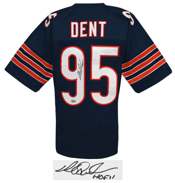 Richard Dent signed navy custom football jersey with 'HOF 11' inscription. Item comes with a Beckett Authentication tamper evident numbered sticker and Certificate of Authenticity which can be verified online. Jersey is size XL.