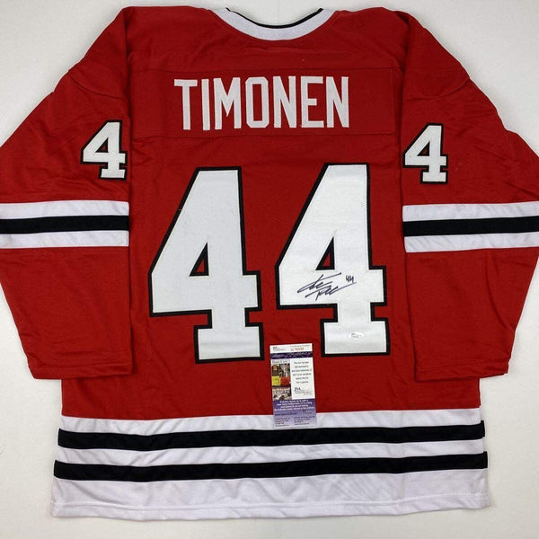 Autographed/Signed KIMMO TIMONEN Chicago Red Hockey Jersey JSA COA Auto This is a custom jersey and was not manufactured by or in any manner associated with any professional sports league or manufacturer. This custom jersey carries no professional sports league designation. The item is intended to be an autographed collectible. The custom jersey displays the name, number and authenticated signature of the player. This item in no way is affiliated with or connected to any professional sports organization. The autograph, as always is guaranteed to be authentic and has been certified as authentic by a third-party, trusted authenticator. Size is XL unless otherwise noted.