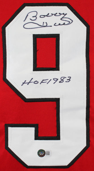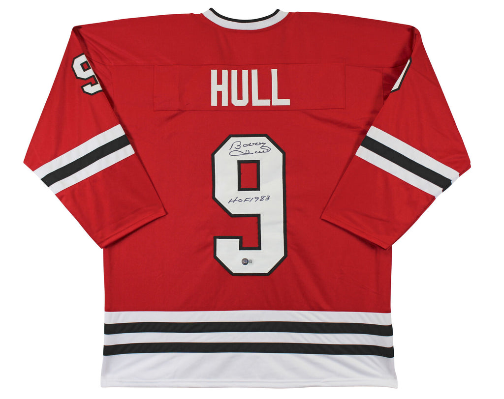 This Autographed Red Pro Style Jersey with the inscription of "HOF 1983" has been Personally Signed by Bobby Hull of the Chicago Blackhawks. This item is 100% Authentic to include a hologram by Beckett Authentication Services. This item will come with an affixed Beckett Authentication Services (BAS) authentication sticker, which includes a scannable QR code to verify authenticity. Please note that Beckett no longer provides serial-numbered COA cards, and the attached BAS sticker will serve as the complete authentication for this item. This is a BAS Witnessed Protection Program item which means a Beckett Authentication Service representative was present when this item was being signed. We have multiples of this same item. While the photographs are representative of this item, the size, placement and strength of the signature may vary. Each item is hand signed, therefore, each autograph is unique. This is a X-Large sized, non-branded, custom-stitched Jersey.