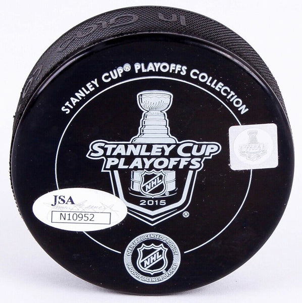 Blackhawks 2015 Stanley Cup Logo Hockey Puck is hand-signed in silver paint-pen by Brent Seabrook.The autograph includes an official James Spence Authentication (JSA) hologram and matching COA for authenticity purposes.Authentication: JSA COA