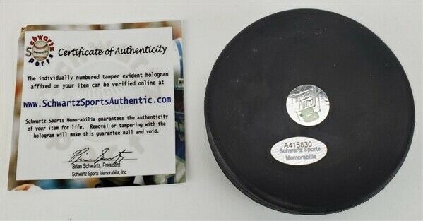 Chicago Blackhawks logo hockey puck. Hand-signed and inscribed in silver paint pen by Glenn Hall (Blackhawks, HOF). The autograph includes an official Schwartz Sports Hologram and matching COA for authenticity purposes.Authentication: Schwartz Sports COA