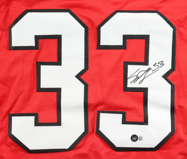 Custom on-ice style jersey. Everything is sewn on, size XL. Hand-signed in black felt-tip pen by Scott Darling. The autograph includes an official Beckett Authentication Services serially numbered hologram and QR Code card for authenticity purposes. The signing of this item was witnessed by Beckett.Authentication: Beckett Hologram with QR Code card