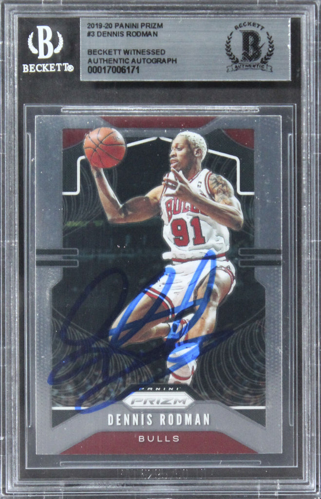 This Autographed 2019 Panini Prizm #3 1988 Fleer #43 Rookie Card has been Personally Signed by Dennis Rodman of the Chicago Bulls. This item is 100% Authentic, it comes slabbed and authenticated by Beckett Authentication Services. We have multiples of this same item. While the photographs are representative of this item, the size, placement and strength of the signature may vary. Each item is hand signed, therefore, each autograph is unique.