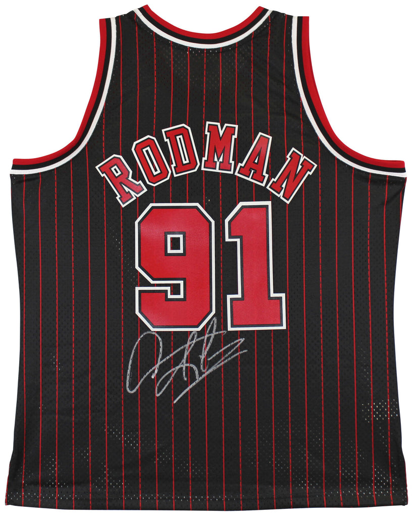 This Autographed Black Mitchell & Ness Hardwood Classics Swingman Jersey has been Personally Signed by Dennis Rodman of the Chicago Bulls. This item is 100% Authentic to include a hologram by Beckett Authentication Services. This item will come with an affixed Beckett Authentication Services (BAS) authentication sticker, which includes a scannable QR code to verify authenticity. Please note that Beckett no longer provides serial-numbered COA cards, and the attached BAS sticker will serve as the complete authentication for this item. This is a BAS Witnessed Protection Program item which means a Beckett Authentication Service representative was present when this item was being signed. We conducted an autograph signing with Dennis Rodman where multiples of the same item were signed. While the photographs are representative of this item, the size, placement and strength of the signature may vary. Each item is hand signed, therefore, each autograph is unique. This item can be verified through BAS Witnessed. This is a X-Large sized, non-branded, custom-stitched Jersey.