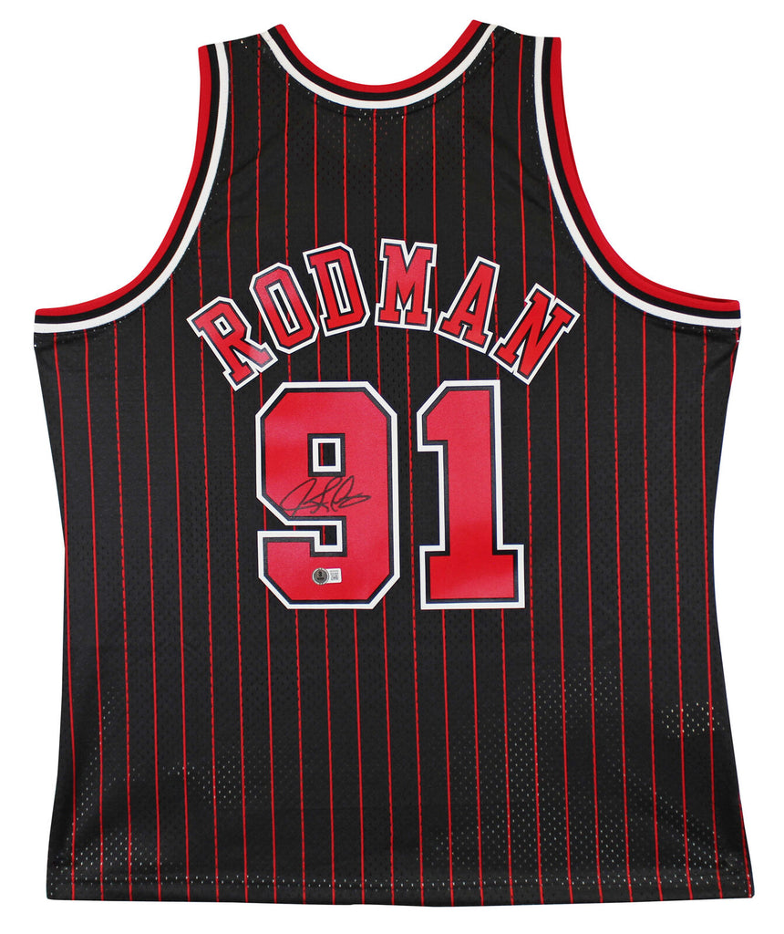 This Autographed w/ Black Signature Black 1995-96 Mitchell & Ness Hardwood Classics Swingman Jersey has been Personally Signed by Dennis Rodman of the Chicago Bulls. This item is 100% Authentic to include a hologram by Beckett Authentication Services. This item will come with an affixed Beckett Authentication Services (BAS) authentication sticker, which includes a scannable QR code to verify authenticity. Please note that Beckett no longer provides serial-numbered COA cards, and the attached BAS sticker will serve as the complete authentication for this item. This is a BAS Witnessed Protection Program item which means a Beckett Authentication Service representative was present when this item was being signed. We conducted an autograph signing with Dennis Rodman where multiples of the same item were signed. While the photographs are representative of this item, the size, placement and strength of the signature may vary. Each item is hand signed, therefore, each autograph is unique. This item can be verified through BAS Witnessed. These jerseys will be size X-Large.