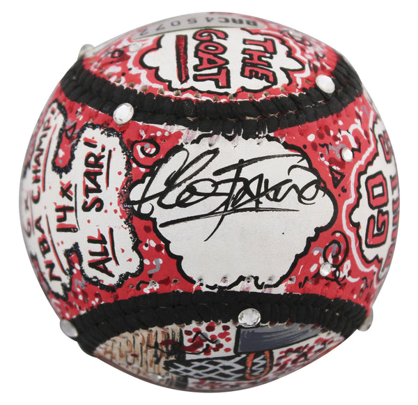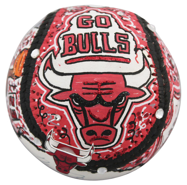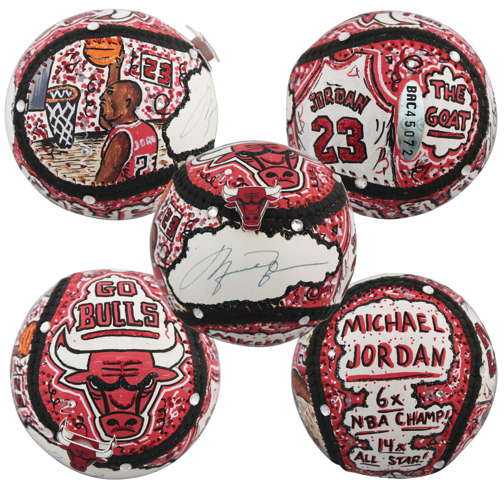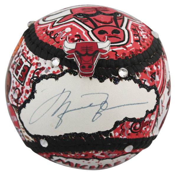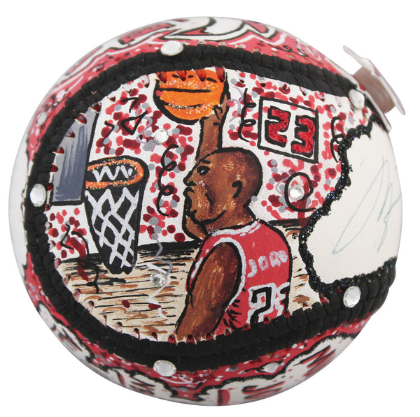 This Autographed Auto Graded Mint 9! Charles Fazzino Hand-painted Artwork Baseball has been Personally Signed by Michael Jordan of the Chicago Bulls. The baseball is decorated throughout by Charles Fazzino in his distinctive style, with several Swarovski crystals attached. The baseball includes an Upper Deck authentication sticker (BAC45072) it does not come with the matching COA from UDA.As the artist for more than a dozen Major League Baseball All-Star Games, Charles Fazzino has created an extensive collection of 3D, hand-painted, pop art baseballs. Each major league baseball is an original work, and collectors can have Fazzino customize these hand-painted pop art baseballs to include references to their favorite players, seasons, and memories. This item is 100% Authentic to include a hologram by Beckett Authentication Services. This item will come with an affixed Beckett Authentication Services (BAS) authentication sticker, which includes a scannable QR code to verify authenticity. Please note that Beckett no longer provides serial-numbered COA cards, and the attached BAS sticker will serve as the complete authentication for this item. The authenticity can be verified on Beckett Authentication Services website.