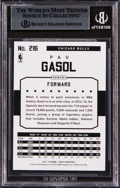 This Autographed 2015 Hoops #216 Card has been Personally Signed by Pau Gasol of the Chicago Bulls. This item is 100% Authentic, it comes slabbed and authenticated by Beckett Authentication Services. The authenticity can be verified on Beckett Authentication Services website.