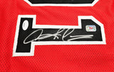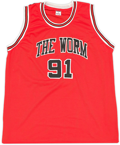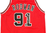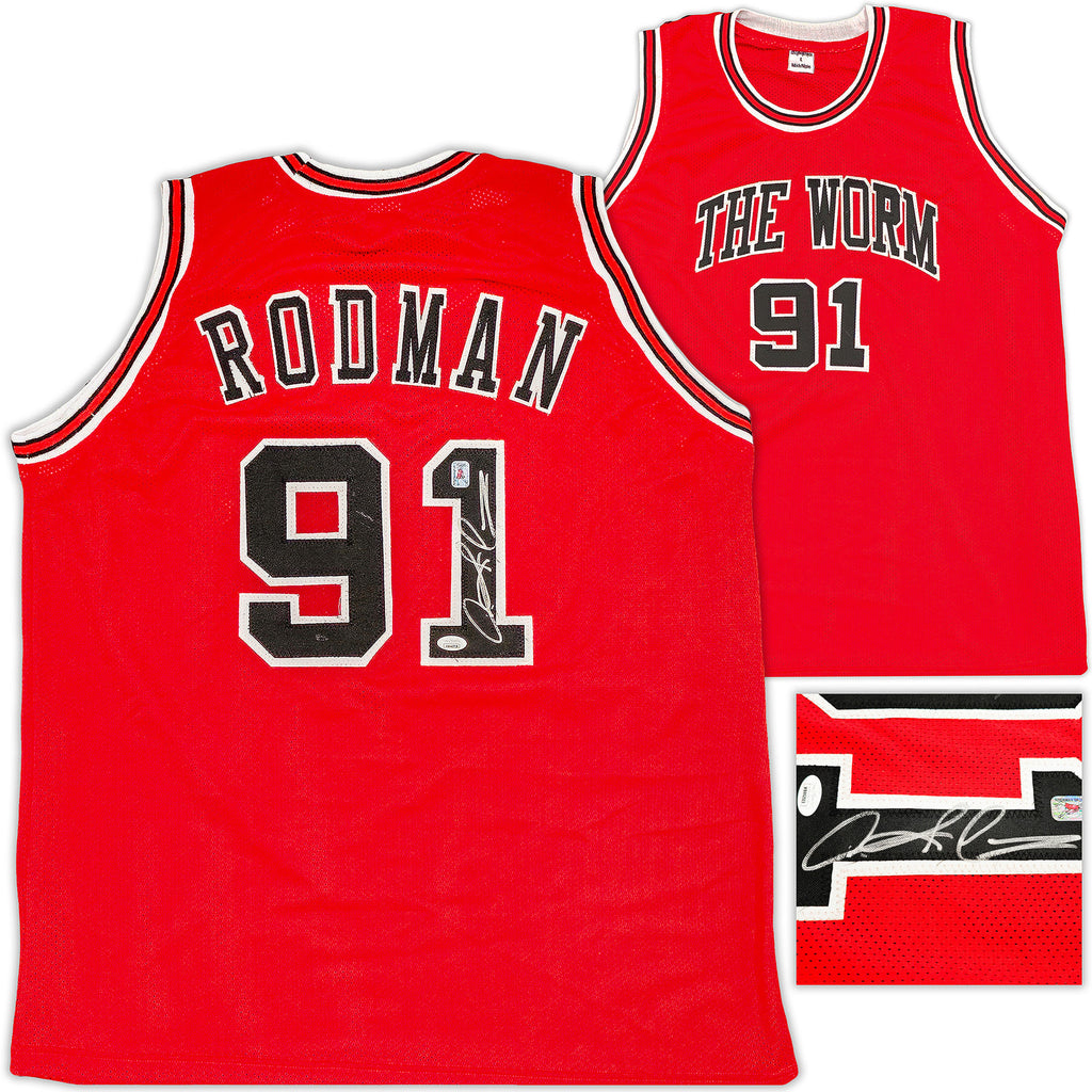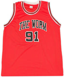 This is a Red Jersey that has been hand signed by Dennis Rodman. This is a custom jersey with no name brand. The approximate size is XL. It has nice sewn in name and numbers. This item has been certified authentic by JSA and comes with their tamper-proof hologram and matching certificate of authenticity.