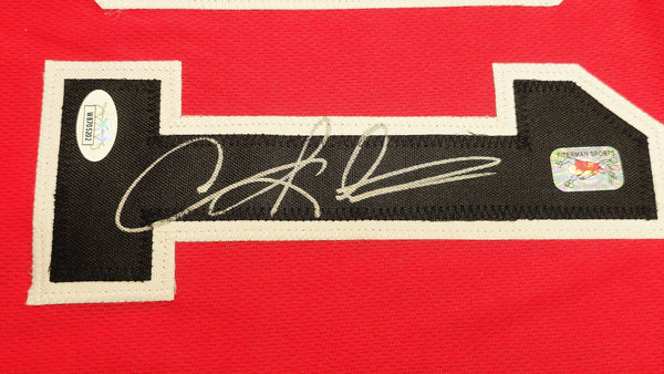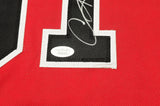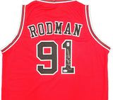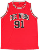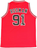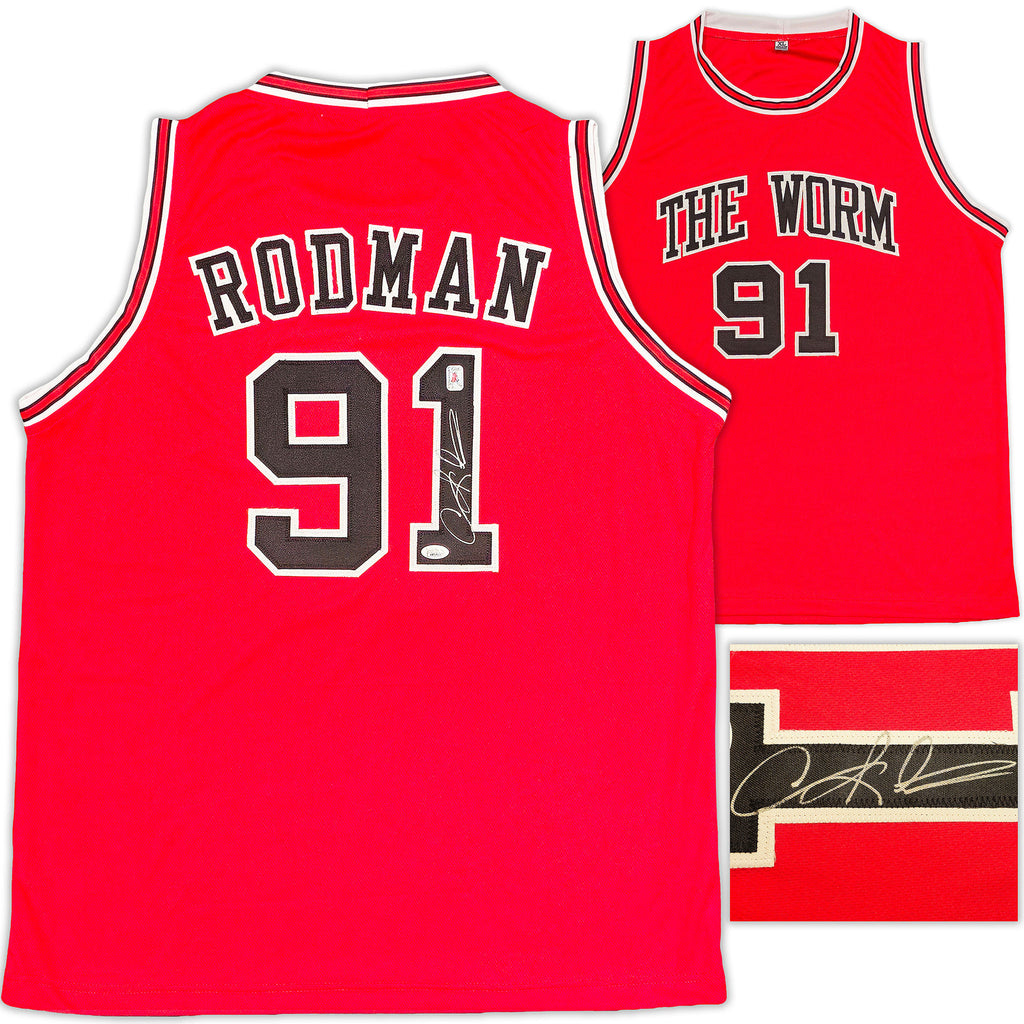 This is a Red Jersey that has been hand signed by Dennis Rodman. This is a custom jersey with no name brand. The approximate size is XL. It has nice sewn in name and numbers. This item has been certified authentic by JSA and comes with their tamper-proof hologram and matching certificate of authenticity.