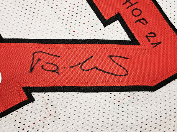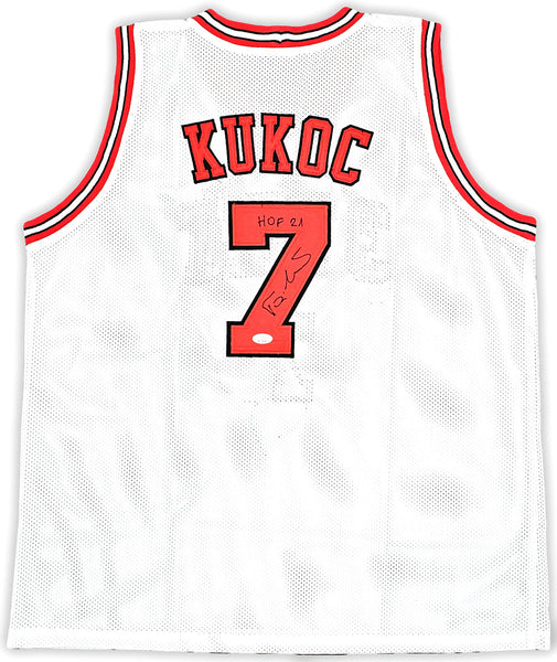 This is a White Jersey that has been hand signed by Toni Kukoc. This is a custom jersey with no name brand. The approximate size is XL. It has nice sewn in name and numbers. This item was inscribed "HOF 21." This item has been certified authentic by JSA and comes with their tamper-proof sticker and matching certificate of authenticity.