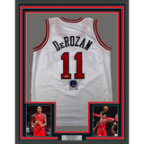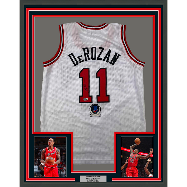 Framed Autographed/Signed DeMar DeRozan 33x42 Chicago White Jersey BAS COA The item is professionally framed and matted with two 5x7 photos, measures 35 inches by 39 inches and is ready to be hung in your man cave! Photo and matting requests can be made.