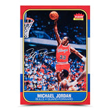 Almost universally regarded as the most important basketball card ever produced, Michael Jordan's 1986-87 Fleer rookie card was the focal point of a paradigm shift that occurred in the sports card industry in the late 1980's. With his popularity soaring on a global basis in the mid-to-late 1980's, Michael Jordan almost singlehandedly forced sports card collectors to shift their spending dollars away from baseball cards and into basketball cards. The tipping point had been reached and the entire sports trading card industry blossomed into a multi-sport category. Michael Jordan's 1986-87 Fleer rookie card simultaneously skyrocketed in value and historical prominence. Even after twenty plus years of time, MJ's Fleer RC remains a cherished icon and centerpiece for many trading collections. With the original image lost in time, Upper Deck commissioned famed sports artist Chuck Gillies to hand paint the 1986-87 Fleer art. His art was then used to produce this "Fleer Blow Up". The "Fleer Blow Up" is almost identical to the original photo and has the matching stats from the original trading card on the back. If you ever wanted your Fleer rookie signed, this is your opportunity. Michael autographed this unique 12.5 x 17.5 Upper Deck Authenticated item in silver paint. Jordan's silver signature has been deemed authentic by virtue of Upper Deck Authenticated's five-step process.