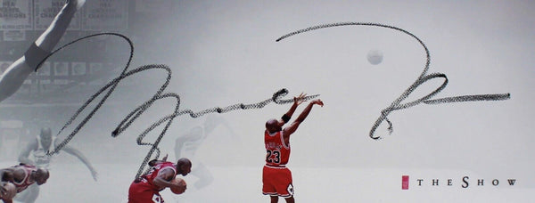 A Chicago Bulls Framed The Show "Last Shot" Picture hand signed by Michael Jordan. The item and signature are in excellent condition. The frame measures approximately 46x20. Michael Jordan is one of the greatest basketball players of all time. He played 15 season for the Chicago Bulls. He is a 6x NBA Champion, 6x NBA Finals MVP, 3x All Star MVP, hold 10 scoring titles. AUTHENTICATION: The item is accompanied by a Upper Deck Certificate of Authenticity - Upper Deck Serial Numbered and Databased Hologram