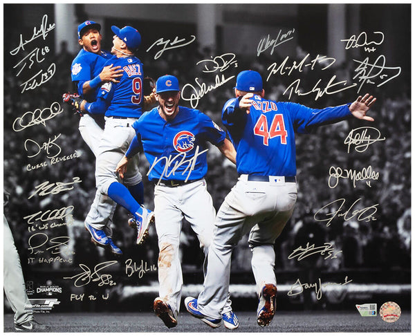 2016 Chicago Cubs Team signed 2016 World Series infielders celebration spotlight 16x20 photo. This team photo is autographed by 24 members of the 2016 World Series Champion Chicago Cubs. Signatures include Kris Bryant, Ben Zobrist, Joe Maddon, David Ross, Theo Epstein, Aroldis Chapman, Jorge Soler, Addison Russell, Mike Montgomery, Albert Almora, Miguel Montero, Travis Wood, Matt Szczur (with 'Fly The W'), Justin Grimm, Jed Hoyer, Tommy La Stella, Chris Coghlan, Hector Rondon, Dave Martinez (with 'Curse Reversed'), Brandon Hyde, Gary Jones, Pedro Strop (with 'It Happened'), Trevor Cahill (with '16 WS Champs') and John Mallee. Item comes with a Schwartz Sports Memorabilia tamper-proof numbered hologram and Certificate of Authenticity which can be verified online.
