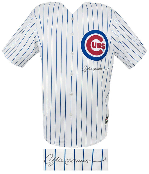 Andre Dawson signed Chicago Cubs white pinstripe Majestic replica baseball jersey. Jersey is signed on the front and back of the jersey is blank. Item comes with a Schwartz Sports Memorabilia tamper-proof numbered hologram and Certificate of Authenticity which can be verified online.