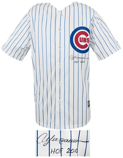 Andre Dawson signed Chicago Cubs white pinstripe Majestic replica baseball jersey with 'HOF 2010' inscription. Jersey is signed on the front and back of the jersey is blank. Item comes with a Schwartz Sports Memorabilia tamper-proof numbered hologram and Certificate of Authenticity which can be verified online.