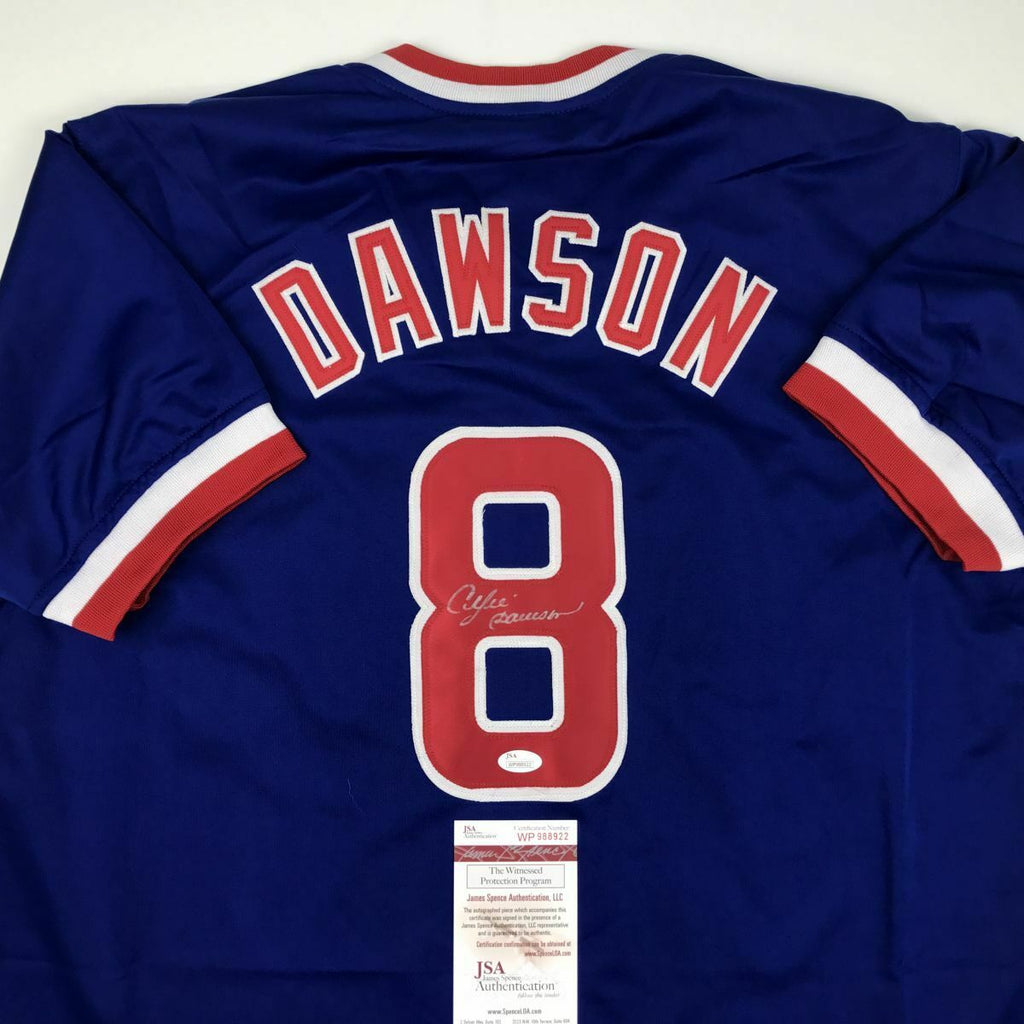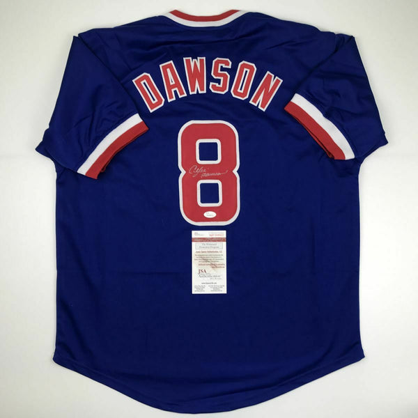 Autographed/Signed ANDRE DAWSON Chicago Blue Baseball Jersey JSA COA Auto This is a custom jersey and was not manufactured by or in any manner associated with any professional sports league or manufacturer. This custom jersey carries no professional sports league designation. The item is intended to be an autographed collectible. Reference of team in the title is to allow the purchaser a point of association. The custom jersey displays the name, number and authenticated signature of the player. This item in no way is affiliated with or connected to any professional sports organization. The autograph, as always is guaranteed to be authentic and has been certified as authentic by a third-party, trusted authenticator. Size is XL unless otherwise noted.