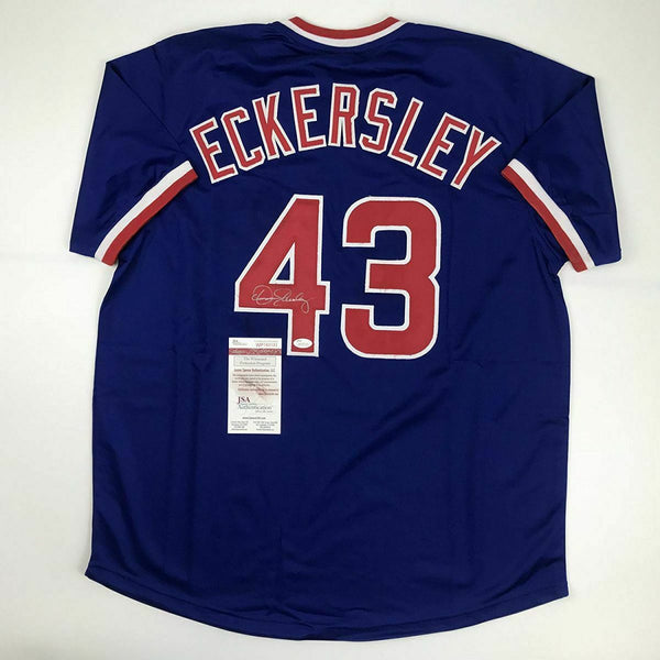 Autographed/Signed DENNIS ECKERSLEY Chicago Blue Baseball Jersey JSA COA Auto This is a custom jersey and was not manufactured by or in any manner associated with any professional sports league or manufacturer. This custom jersey carries no professional sports league designation. The item is intended to be an autographed collectible. Reference of team in the title is to allow the purchaser a point of association. The custom jersey displays the name, number and authenticated signature of the player. This item in no way is affiliated with or connected to any professional sports organization. The autograph, as always is guaranteed to be authentic and has been certified as authentic by a third-party, trusted authenticator. Size is XL unless otherwise noted.