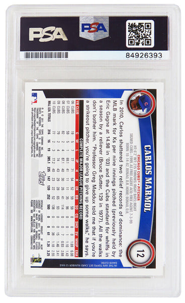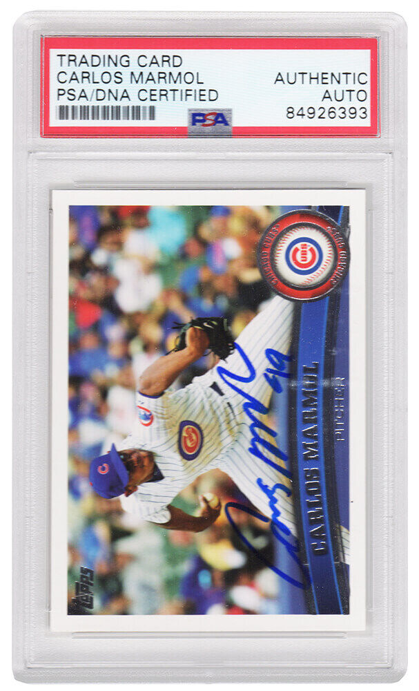 Carlos Marmol signed Chicago Cubs 2011 Topps baseball card #12. The card has been authenticated and encapsulated by PSA/DNA and the number can be verified online. The image of the item is a stock photo, as we may have multiples of the item in stock. The Slabbed Card you will receive will be of the card described. (Same grade, Same authentication) You may or may not receive the exact PSA serial number on the slab label shown in image.