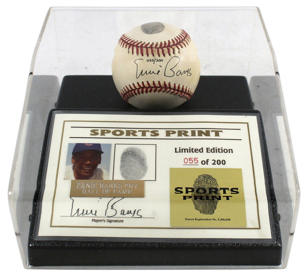 This Autographed Limited Edition Numbered To 200 w/ Display Case Thumbprint Onl Baseball has been Personally Signed by Ernie Banks of the Chicago Cubs. This item is 100% Authentic to include a Certificate of Authenticity (COA) / hologram by Beckett Authentication Services. We have multiples of this same item. While the photographs are representative of this item, the size, placement and strength of the signature may vary. Each item is hand signed, therefore, each autograph is unique. Each ball has a thumbprint of Ernie Banks , the photo in the case is also signed and has Ernie Banks signature, though the Beckett COA does not cover both signatures. These vintage balls all have some varying degrees of spotting and toning. We are not able to guarantee the coloring of the ball, and the number of the edition you may receive.