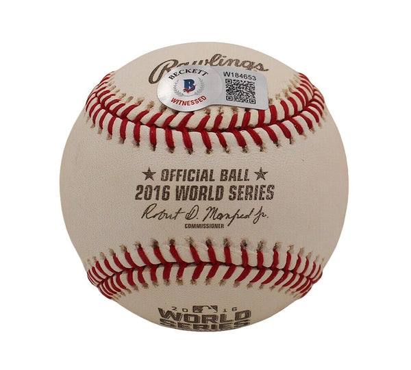 A Chicago Cubs Rawlings Official Major League 2016 World Series White MLB Baseball hand signed by David Ross. The item and signature are in excellent condition. David is a former professional Catcher for the Chicago Cubs and a 2x All Star. AUTHENTICATION: The item is accompanied by a Beckett Serial Numbered and Databased Hologram.