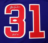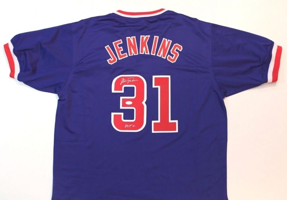 Custom on-field style jersey. Everything is sewn on, size XL. Hand-signed in silver paint pen by Ferguson Jenkins (HOF). The lot / autograph(s) includes an official James Spence Authentication (JSA) hologram for authenticity purposes. The signing of this item was witnessed by JSA.Authentication: JSA Hologram Shop our ebay store / Friendly Confines Collectibles for thousands of different autographed jerseys