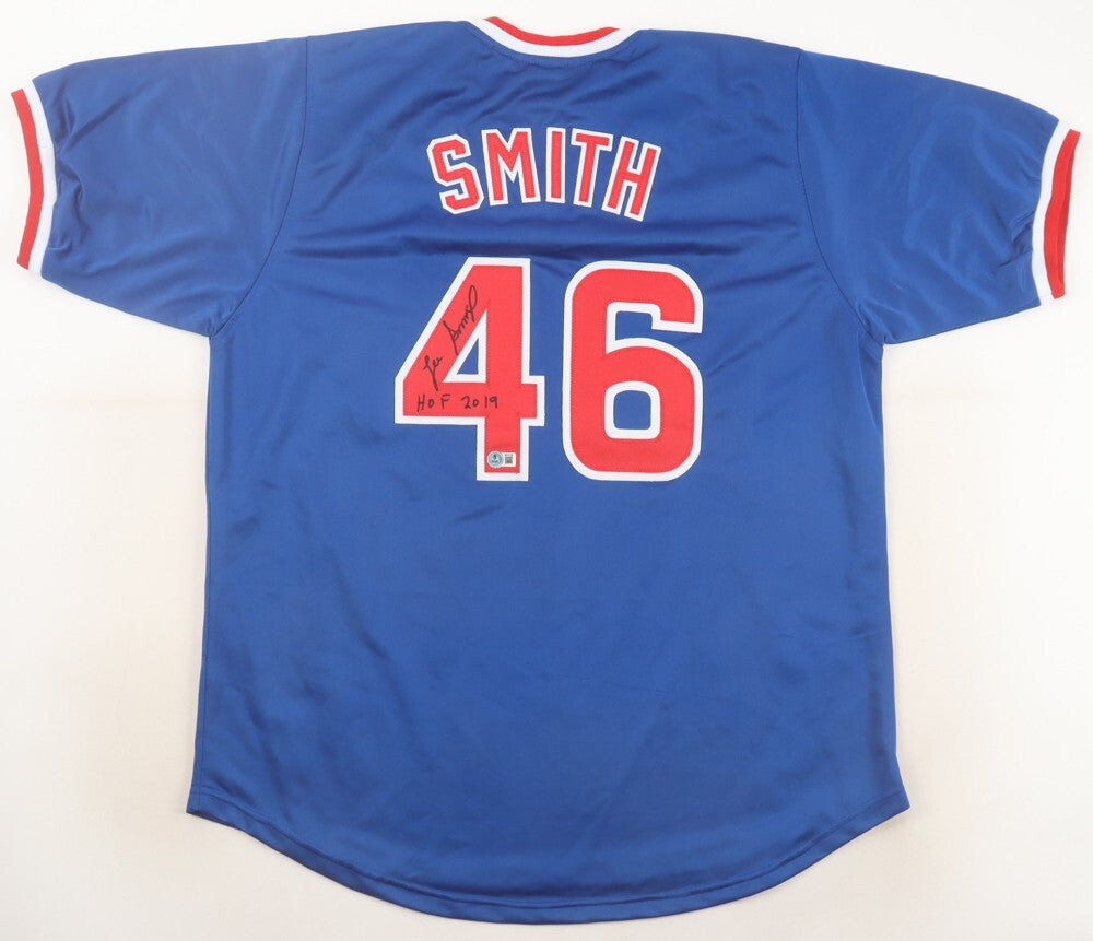 Custom on-field style jersey. Everything is sewn on, size XL. Hand-signed in black felt-tip pen by Lee Smith (Cubs, Cardinals). The autograph includes an official Beckett Authentication Services serially numbered hologram and QR Code card for authenticity purposes. The signing of this item was witnessed by Beckett.Authentication: Beckett Hologram with QR Code card