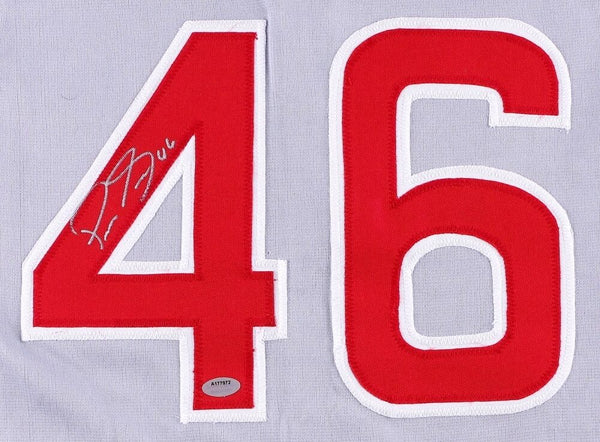 Custom on-field style jersey. Everything sewn on, size XL. Hand-signed in silver paint pen by Pedro Strop (Rangers). The autograph includes an official Schwartz Sports Hologram and matching COA for authenticity purposes.Authentication: Schwartz Sports COA