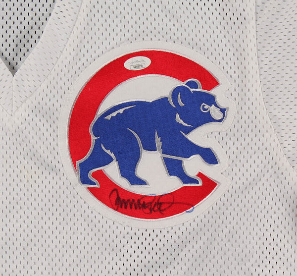Majestic on-field style batting practice jersey. Everything is sewn on, size XL. Hand-signed in blue felt tip pen by Ryne Sandberg (Chicago Cubs, HOF). The lot / autograph(s) includes an official James Spence Authentication (JSA) hologram and matching COA for authenticity purposes. Authentication: JSA COA