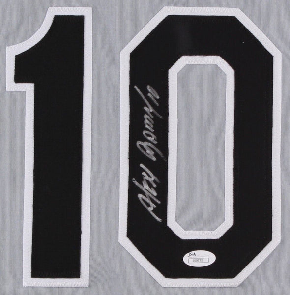 Custom on-field style jersey. Everything sewn on, size XL. Hand-signed in silver paint pen by Alexei Ramirez. The lot / autograph(s) includes an official James Spence Authentication (JSA) hologram and matching COA for authenticity purposes.Authentication: JSA COA