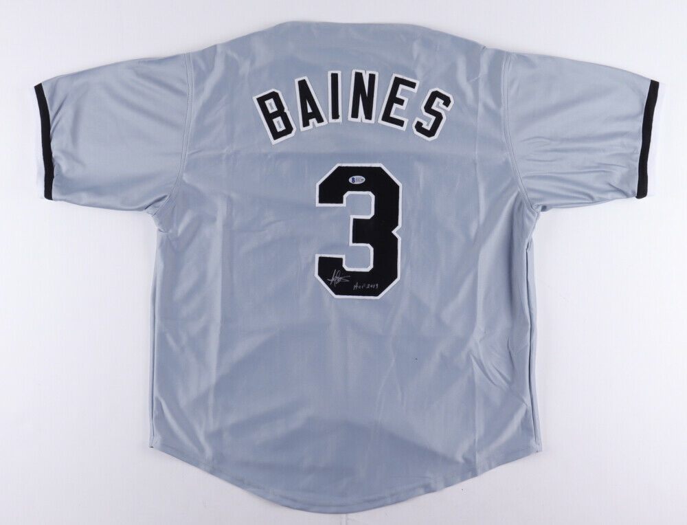 On-field style jersey. Everything is sewn on, size XL. Has been hand-signed and inscribed by Harold Baines (HOF).The lot / autograph(s) includes an official Beckett Authentication Services serially-numbered hologram and matching COA for authenticity purposes. The signing of this item was witnessed by Beckett.Authentication: Beckett COA