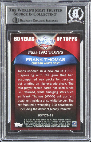 This Autographed 2011 Topps 60 Years of Topps #41 Card has been Personally Signed by Frank Thomas of the Chicago White Sox. This item is 100% Authentic, it comes slabbed and authenticated by Beckett Authentication Services. We have multiples of this same item. While the photographs are representative of this item, the size and placement of the signature may vary. Each item is hand signed, therefore, each autograph is unique.
