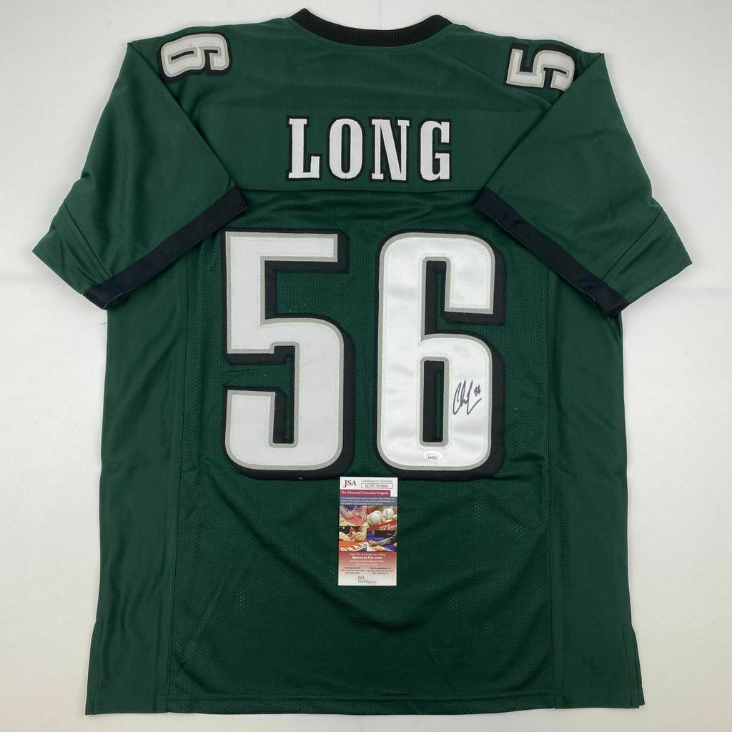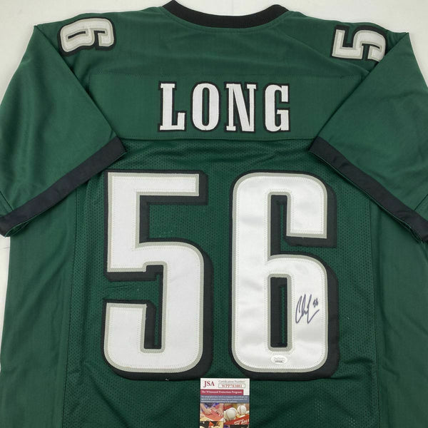 Autographed/Signed CHRIS LONG Philadelphia Green Football Jersey JSA COA Auto This is a custom jersey and was not manufactured by or in any manner associated with any professional sports league or manufacturer. This custom jersey carries no professional sports league designation. The item is intended to be an autographed collectible. Reference of team in the title is to allow the purchaser a point of association. The custom jersey displays the name, number and authenticated signature of the player. This item in no way is affiliated with or connected to any professional sports organization. The autograph, as always is guaranteed to be authentic and has been certified as authentic by a third-party, trusted authenticator. Size is XL unless otherwise noted.