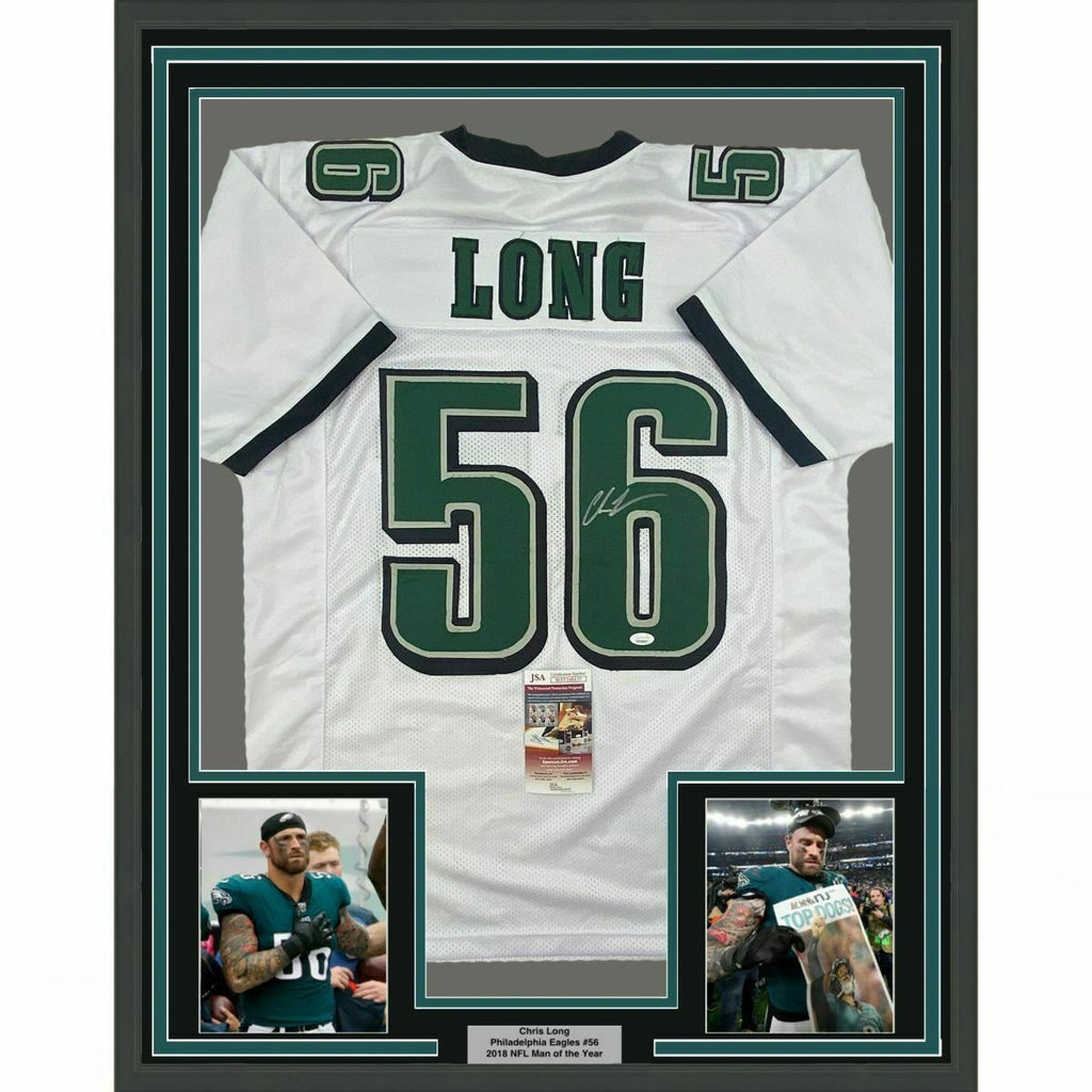 FRAMED Autographed/Signed CHRIS LONG 33x42 Philadelphia White Jersey JSA COA The item is professionally framed & matted with two 8x10 photos, measures 33"x42" and is ready to be hung in your man cave! NOTE: COA card will be mounted on the back of the frame, not inside it on top of the jersey as seen in the picture. Please allow up to 5 business days for the item to be framed, packaged safely, and picked up by UPS. Photo and matting requests can be made.
