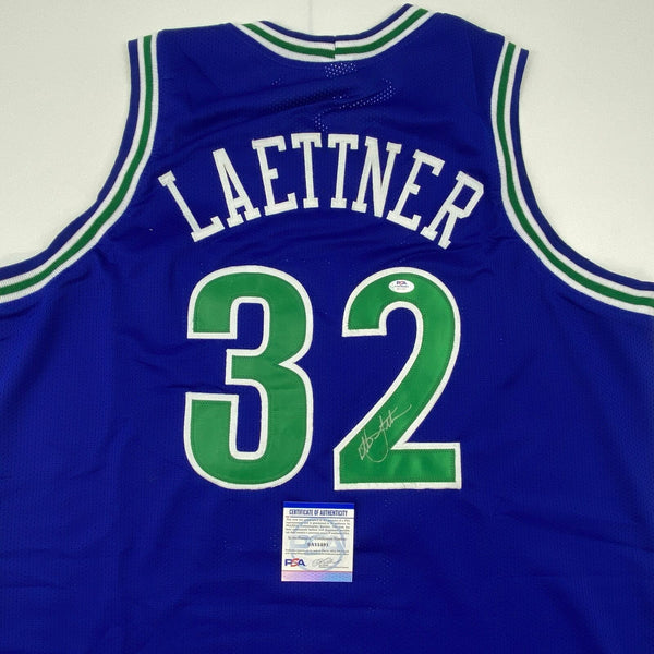Autographed/Signed Christian Laettner Minnesota Blue Basketball Jersey PSA COA This is a custom jersey and was not manufactured by or in any manner associated with any professional sports league or manufacturer. This custom jersey carries no professional sports league designation. The item is intended to be an autographed collectible. Reference of team in the title is to allow the purchaser a point of association. The custom jersey displays the name, number and authenticated signature of the player. This item in no way is affiliated with or connected to any professional sports organization. The autograph, as always is guaranteed to be authentic and has been certified as authentic by a third-party, trusted authenticator. Size is XL unless otherwise noted.