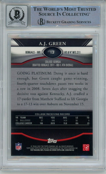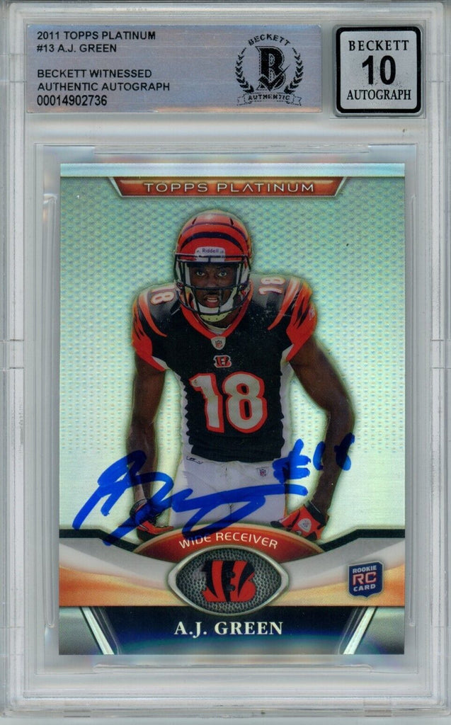 AJ Green Signed Bengals 2011 Topps Platinum #13 Beckett Auto 10 40683 The number in the listing title is just an inventory sku for our records and is not the authentication number. This is a 2011 Topps Platinum #13 trading card that was personally autographed by AJ Green. This was professionally authenticated and slabbed by Beckett Authentication Services (BAS), also includes a certificate of authenticity from Denver Autographs.