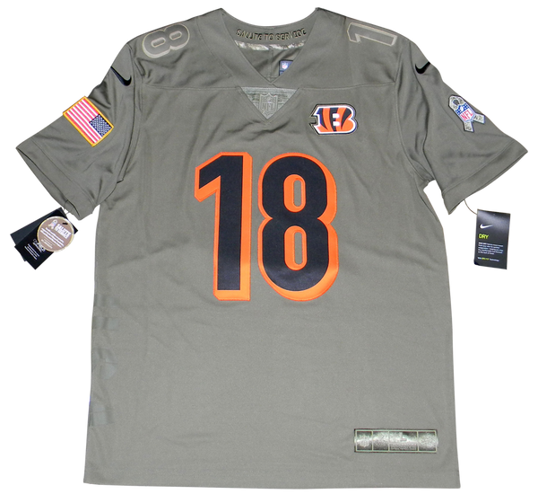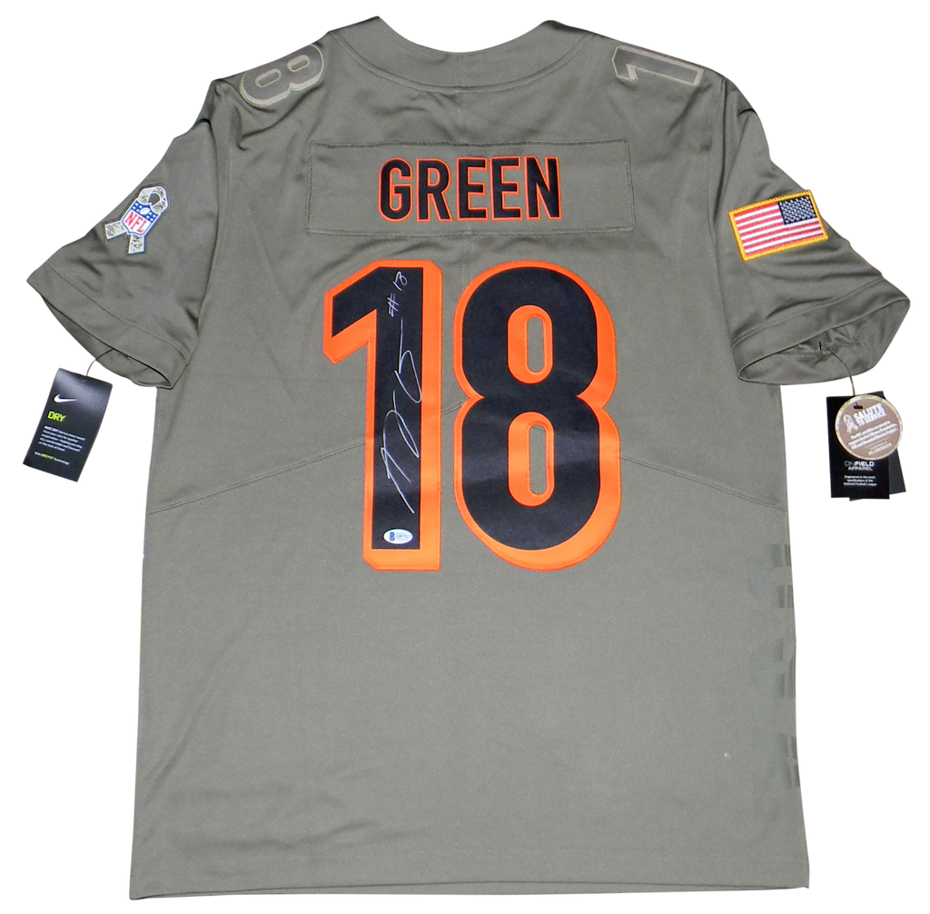 AJ Green, All-Pro wide receiver for the Cincinnati Bengals, has hand signed this Salute to Service Nike Limited jersey. Jersey is new with tags attached and all letters/numbers are sewn on. This item comes with a certificate of authenticity (COA) from Beckett Authentication Services, one of the best authenticators in the industry. You will receive a serial-numbered COA along with a matching serial-numbered sticker on the jersey. The authenticity can be verified online by entering the serial number.Item pictured may not be the exact item you will receive. It will be similar quality, and we guarantee your satisfaction.