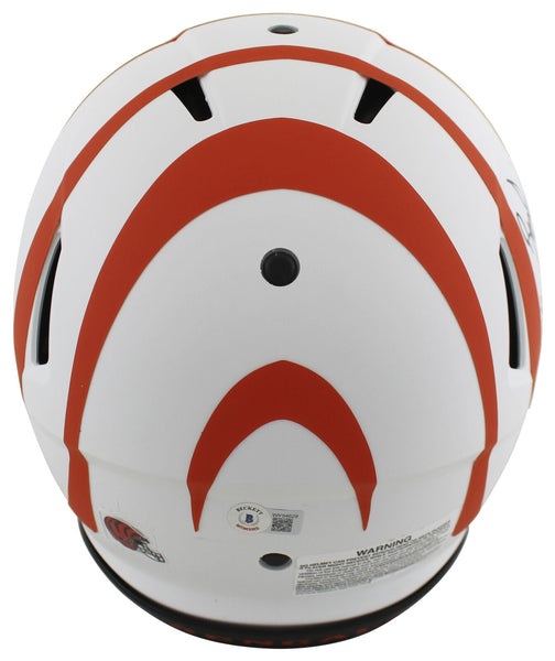 This Autographed Alternate Lunar Riddell Authentic Full Size Speed Proline Helmet with the inscription of "Welcome To The Jungle, 1988 NFL MVP" has been Personally Signed by Boomer Esiason of the Cincinnati Bengals. This item is 100% Authentic to include a hologram by Beckett Authentication Services. This item may come with the new Beckett Authentication hologram that has a scannable QR code rather than the traditional COA. If you would like to have a COA, you are welcome to reach out to Beckett for a printed certification once you receive your item. This is a BAS Witnessed Protection Program item which means a Beckett Authentication Service representative was present when this item was being signed. We conducted an autograph signing with Boomer Esiason where multiples of the same item were signed. While the photographs are representative of this item, the size, placement and strength of the signature may vary. Each item is hand signed, therefore, each autograph is unique. This item can be verified through BAS Witnessed.