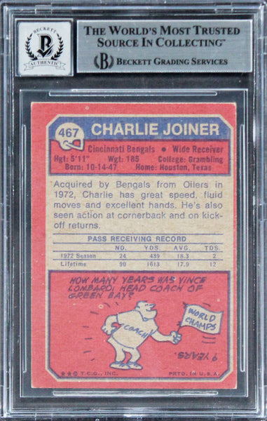 This Autographed Auto Graded Gem Mint 10! 1973 Topps #467 Card with the inscription of "HOF 96" has been Personally Signed by Charlie Joiner of the Cincinnati Bengals. This item is 100% Authentic, it comes slabbed and authenticated by Beckett Authentication Services. The authenticity can be verified on Beckett Authentication Services website.
