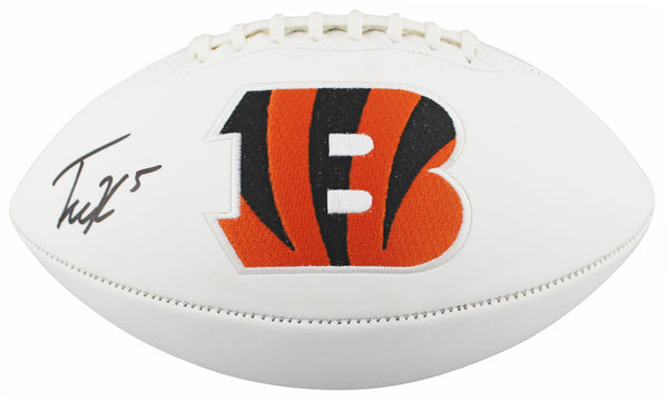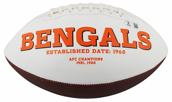 This Autographed Rawlings White Panel Logo Football has been Personally Signed by Tee Higgins of the Cincinnati Bengals. This item is 100% Authentic to include a hologram by Beckett Authentication Services. This item will come with an affixed Beckett Authentication Services (BAS) authentication sticker, which includes a scannable QR code to verify authenticity. Please note that Beckett no longer provides serial-numbered COA cards, and the attached BAS sticker will serve as the complete authentication for this item. This is a BAS Witnessed Protection Program item which means a Beckett Authentication Service representative was present when this item was being signed. We conducted an autograph signing with Tee Higgins where multiples of the same item were signed. While the photographs are representative of this item, the size, placement and strength of the signature may vary. Each item is hand signed, therefore, each autograph is unique. This item can be verified through BAS Witnessed.