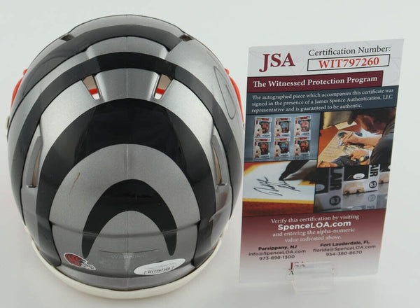 Cincinnati Bengals mini-helmet. Hand-signed in black felt-tip pen by Carson Palmer. The lot / autograph(s) includes an official James Spence Authentication (JSA) hologram and matching COA for authenticity purposes. The signing of this item was witnessed by JSA.Authentication: JSA COA