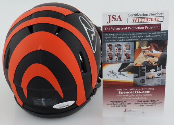 Cincinnati Bengals mini-helmet. Hand-signed in black felt-tip pen by Carson Palmer. The lot / autograph(s) includes an official James Spence Authentication (JSA) hologram and matching COA for authenticity purposes. The signing of this item was witnessed by JSA.Authentication: JSA COA
