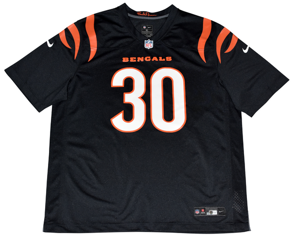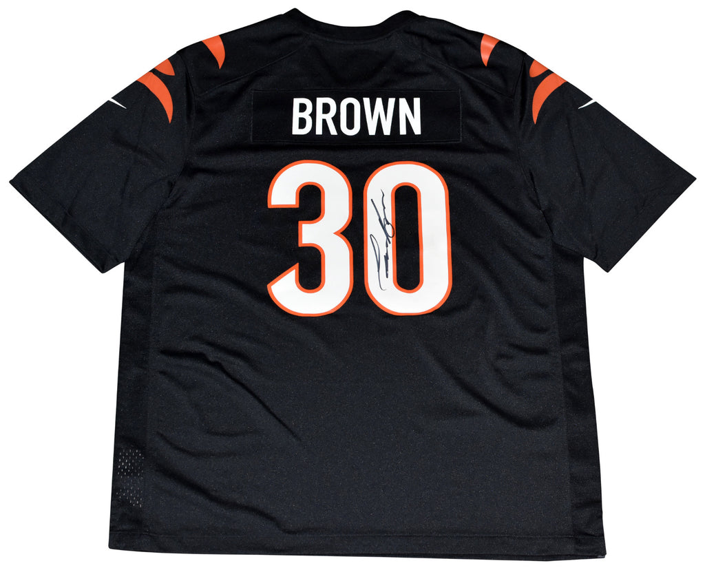 Chase Brown, star running back for the Cincinnati Bengals, has hand signed this Nike jersey at a private signing. Jersey is new with tags attached and all letters/numbers are heat sealed. This item is authenticated by Beckett Authentication Services, one of the best authenticators in the industry. Their tamper-evident hologram featuring a QR code and serial number is on the item. The authenticity can be verified online by entering the serial number or scanning the QR code.Item pictured may not be the exact item you will receive. It will be similar quality, and we guarantee your satisfaction.