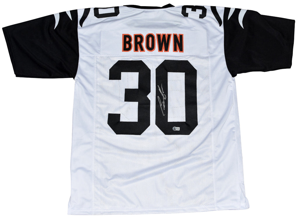 Chase Brown, star running back for the Cincinnati Bengals, has hand signed this custom jersey at a private signing. Jersey is size XL and all letters/numbers are sewn-on. This item is authenticated by Beckett Authentication Services and was signed in the presence of one of their representatives. Their tamper-evident hologram featuring a QR code and serial number is on the item. The authenticity can be verified online by entering the serial number or scanning the QR code.Item pictured may not be the exact item you will receive. It will be similar quality, and we guarantee your satisfaction.