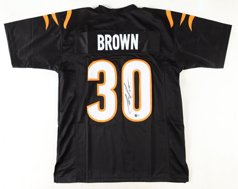 Custom on-field style jersey with everything sewn on, size XL. Hand-signed by Chase Brown.The autograph includes an official Beckett Authentication Services serially numbered hologram and QR Code card for authenticity purposes. The signing of this item was witnessed by Beckett.Authentication: Beckett Hologram with QR Code card